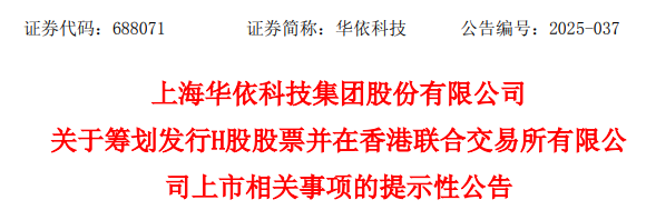 来自上海浦东新区的A股上市公司华依科技(688071.SH)发布公告称,为满足公司国际化战略及海外业务布局需要,提升公司国际品牌知名度,增强公司综合竞争力,正在筹划发行境外上市股份(H股)并申请在香港联合交易所有限公司主板挂牌上市。